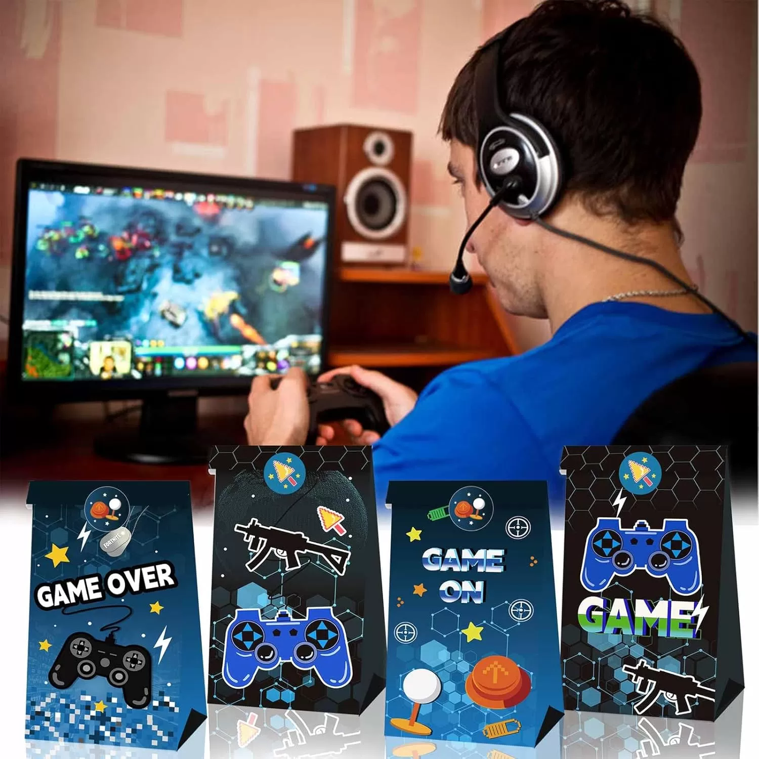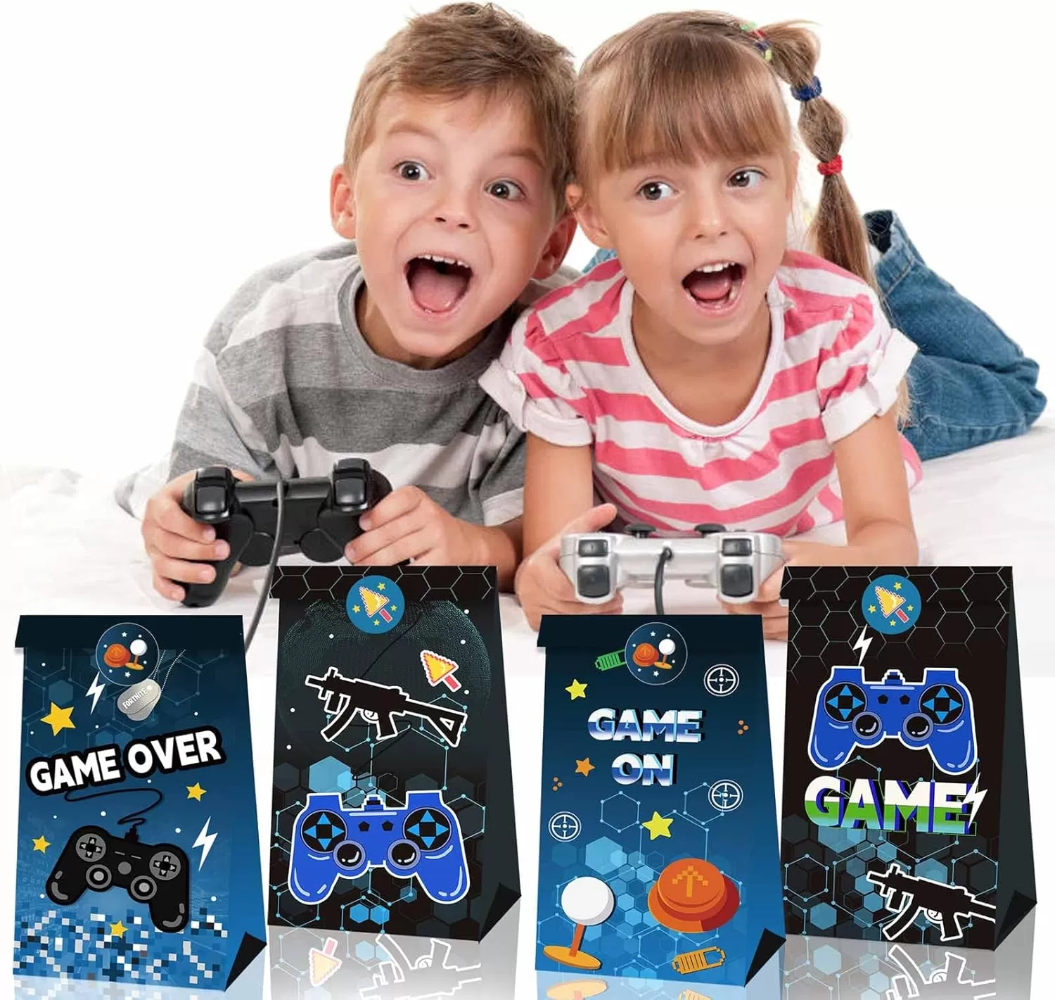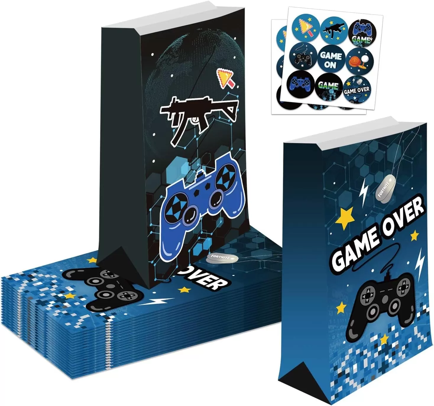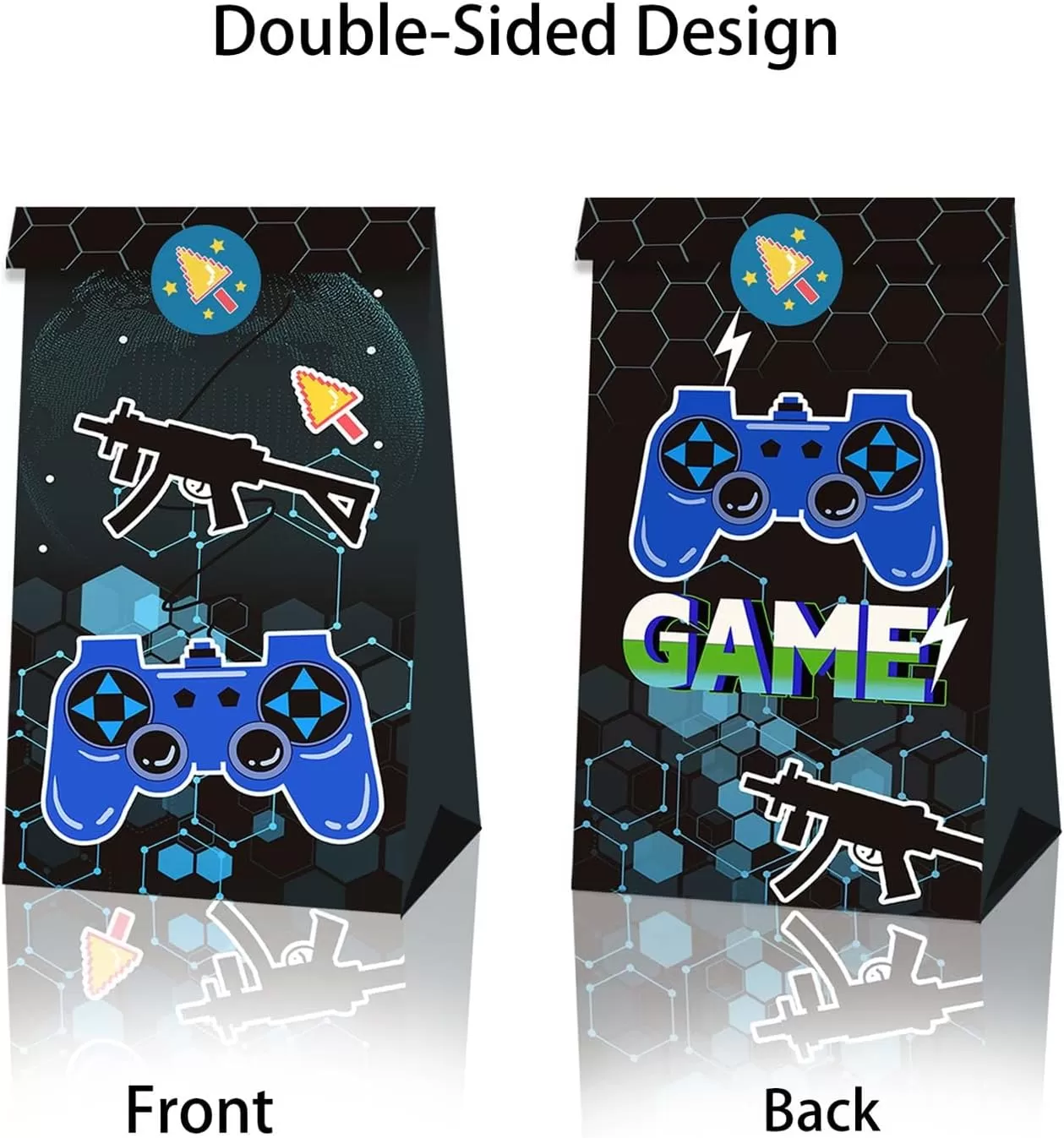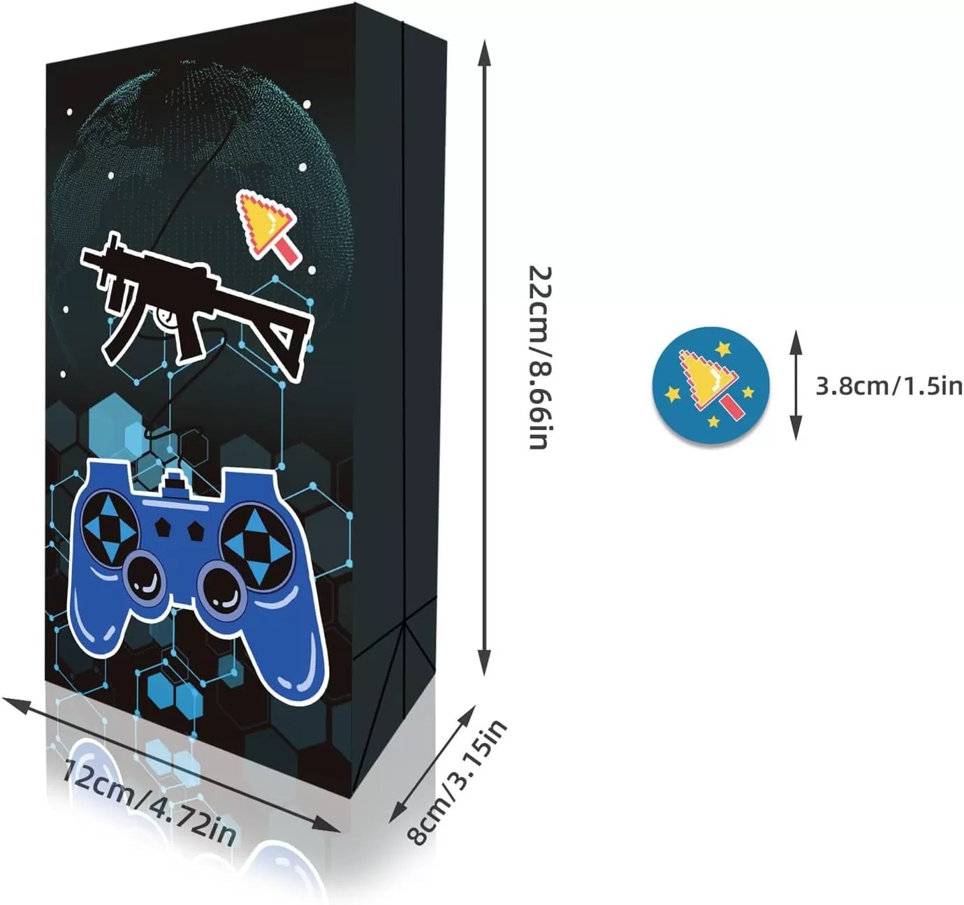 クールなゲームコントローラーテーマの紙袋:この12ピースのゲームコントローラーの紙袋は、古典的なコントローラーボタン、方向キー、またはクールなゲーム要素のパターンで印刷された目を引くゲームコントローラーテーマのデザインを特徴としています。