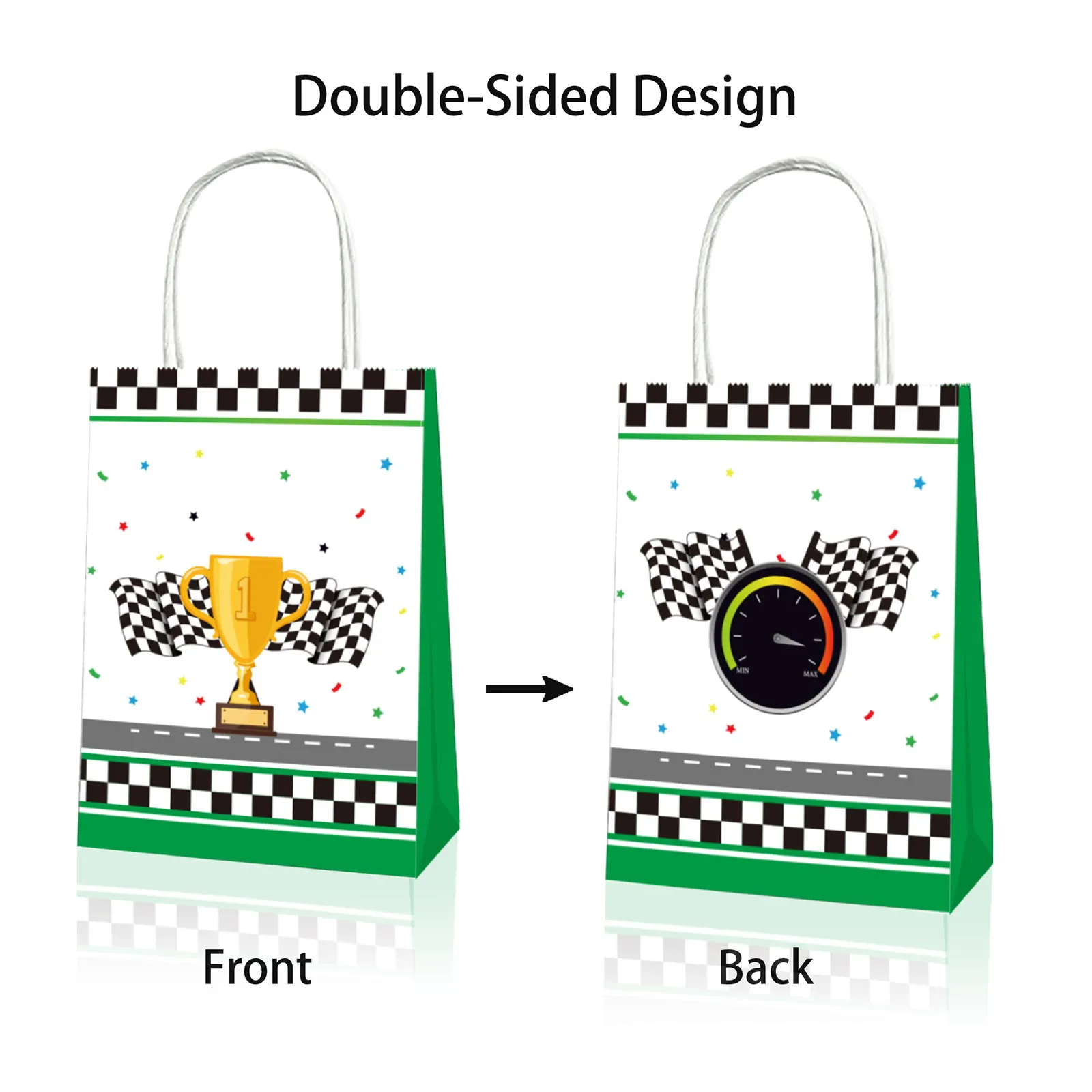 JIELEN 12 PCSレーシングカーの紙袋、黒と白のチェック柄の紙袋、戦利品袋、レーシングテーマのギフト袋、お土産袋、クラフト紙のキャリーバッグ
