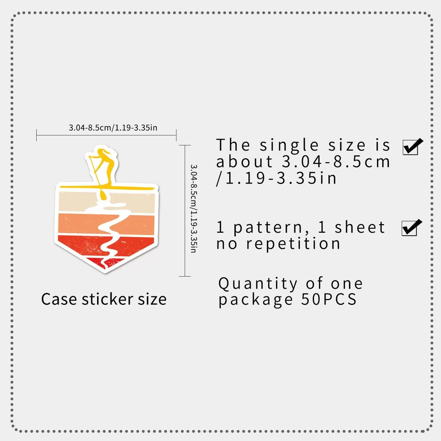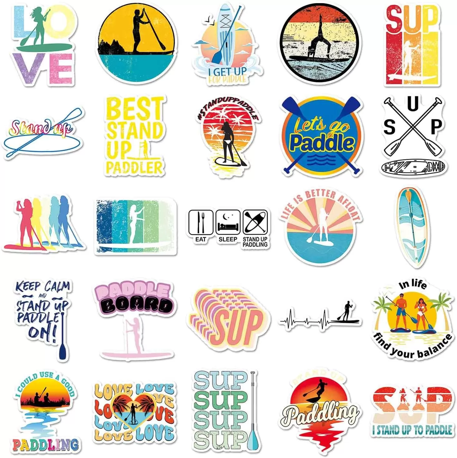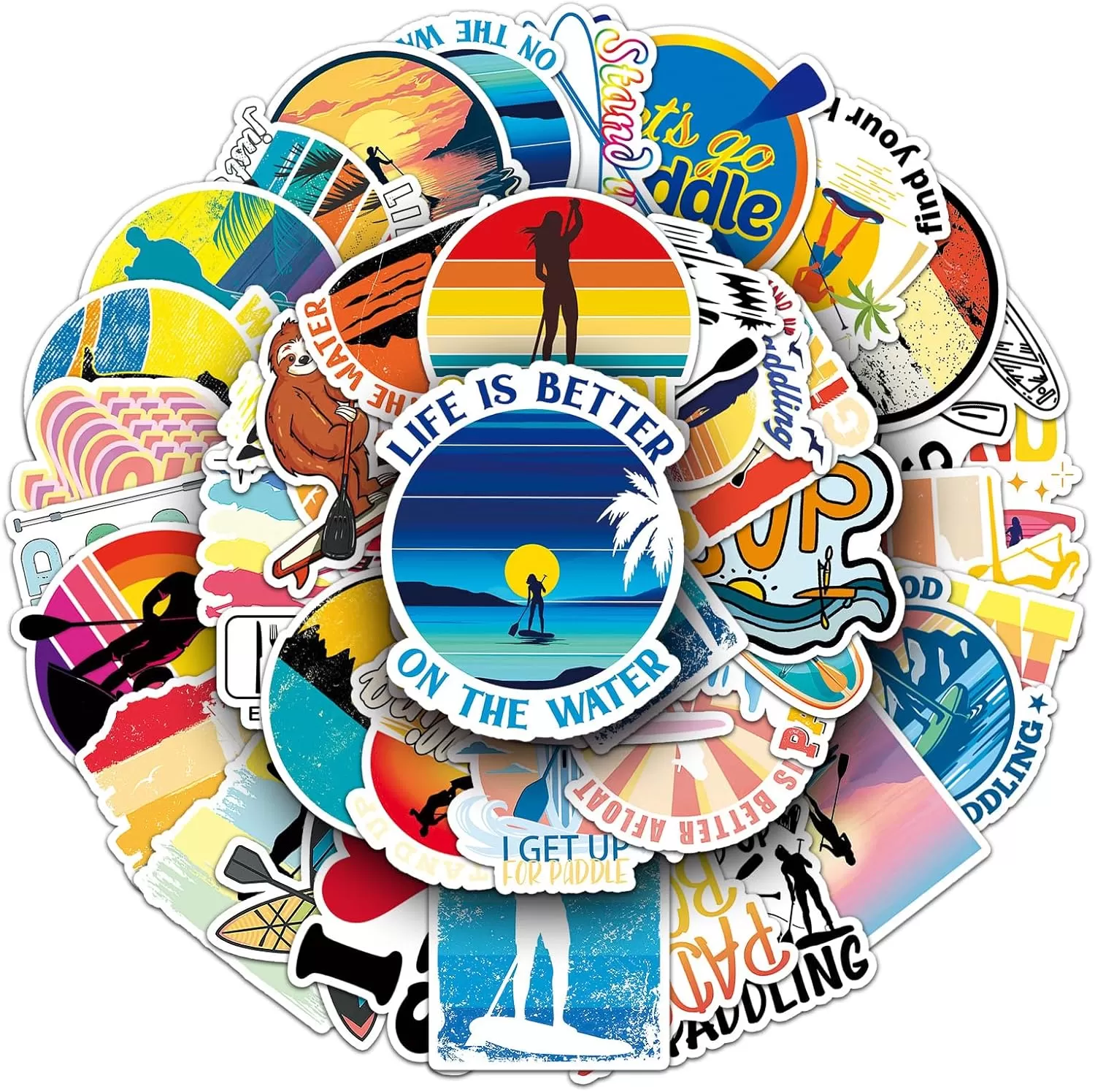 製品パッケージ: 50種類の異なるスタンドアップパドルボードステッカーがあり、繰り返しのないユニークなデザインと適度なサイズが特徴です。
