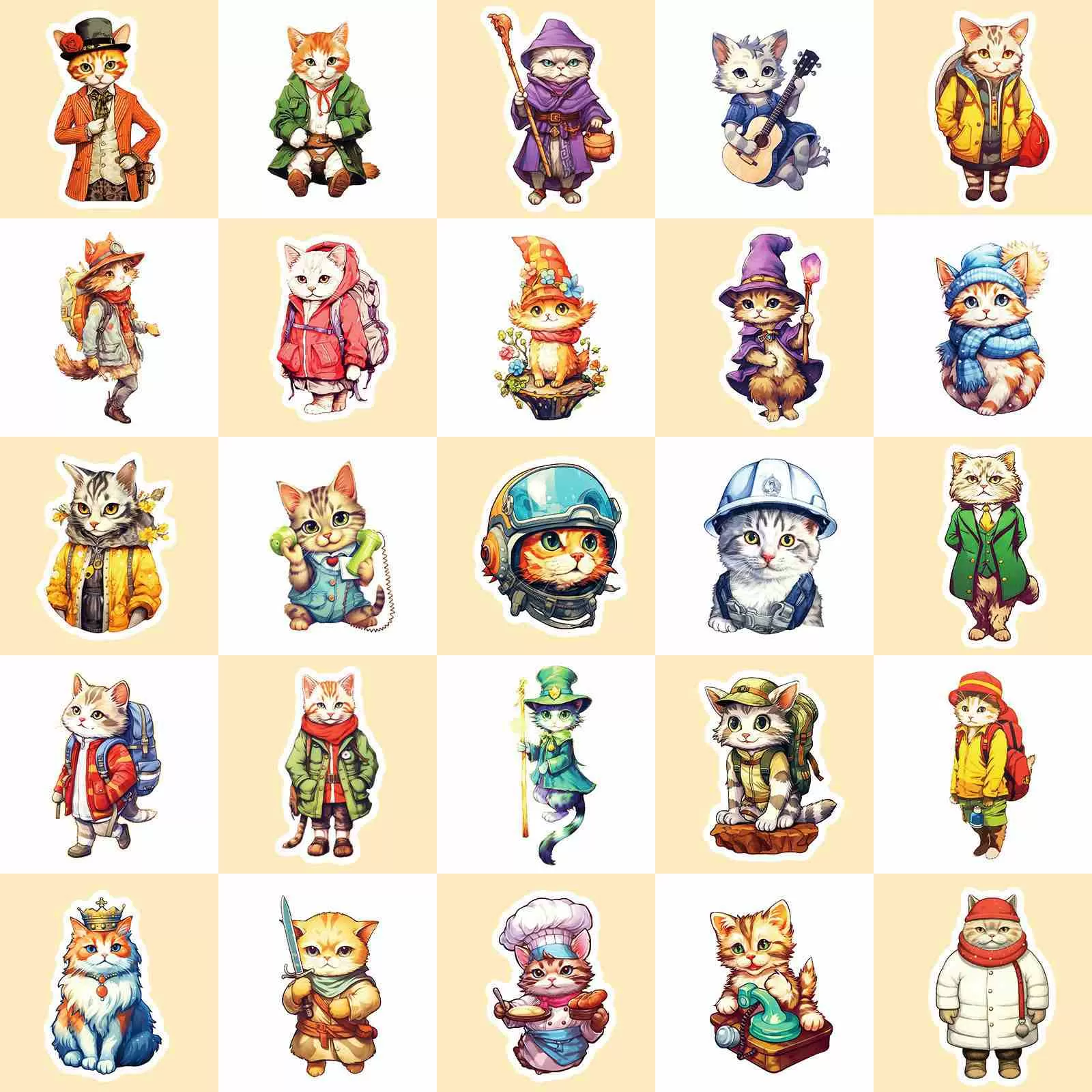 鮮やかな水彩アートデザイン:柔らかい水彩スタイルで描かれた50のユニークな魅力的な猫のイラストが特徴で、それぞれが小さな帽子をかぶっています。この美的で芸術的なデザインセットは、あなたの持ち物に気まぐれなタッチを加えるのに最適です。
